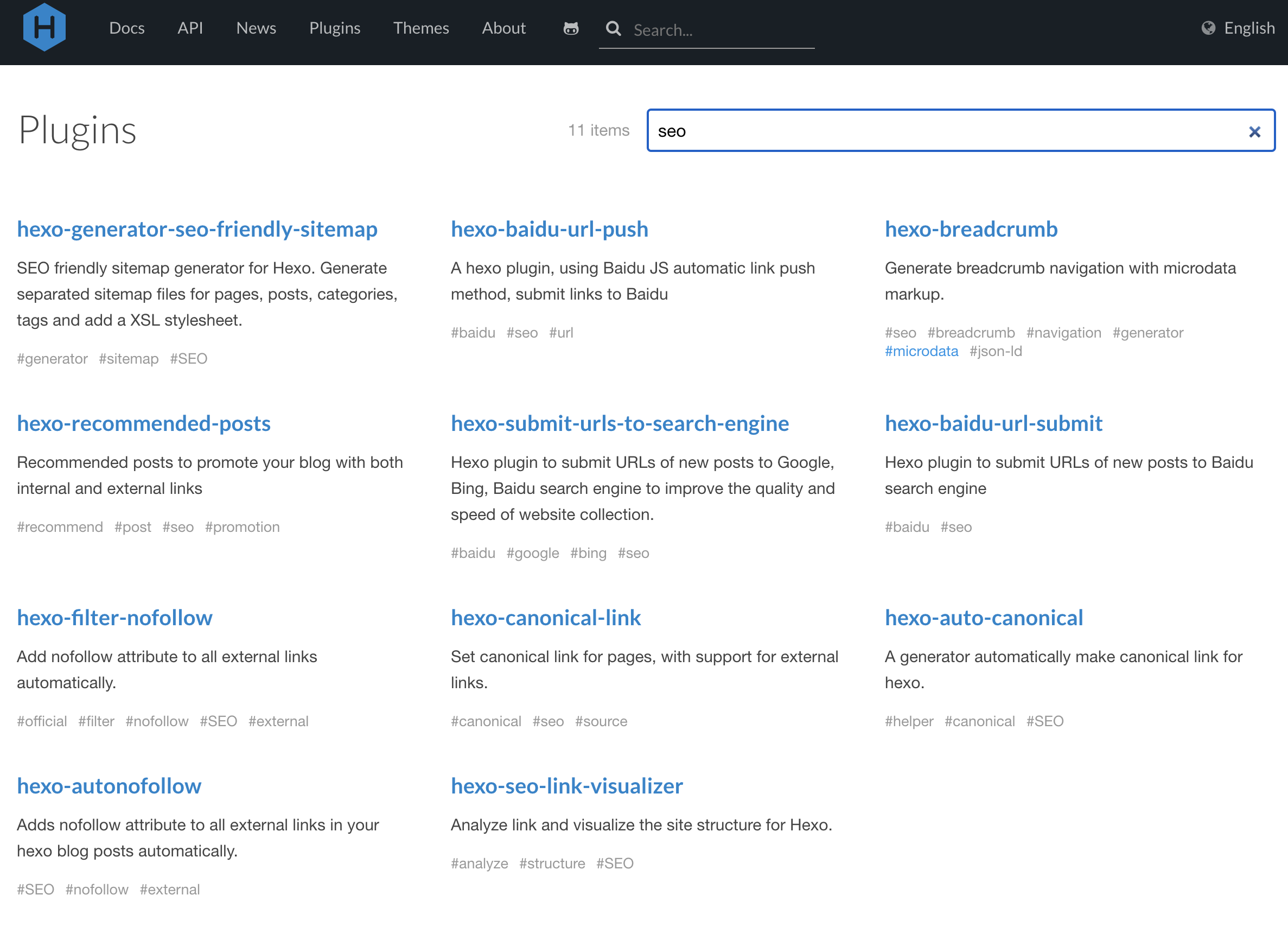 hexo 에서는 SEO와 관련된 플러그인들이 다양하게 있습니다. https://hexo.io/plugins/ 접속하신후 seo라고 입력하고 검색을 수행하면 아래와 같은 다양한 plugin을 확인할수 있습니다. 그중 일반적으로 많이 사용하는 플러그인들을 설치해 보겠습니다.